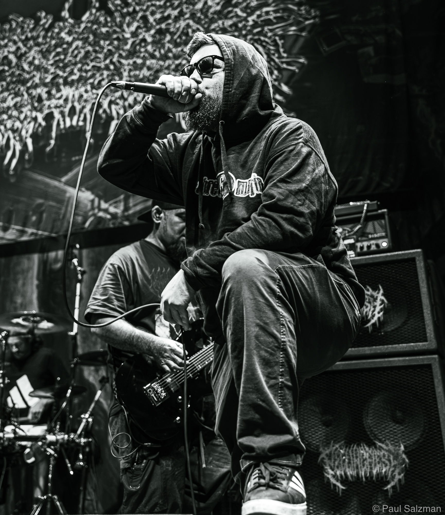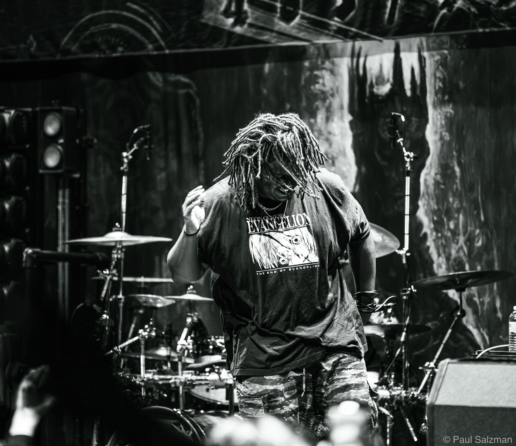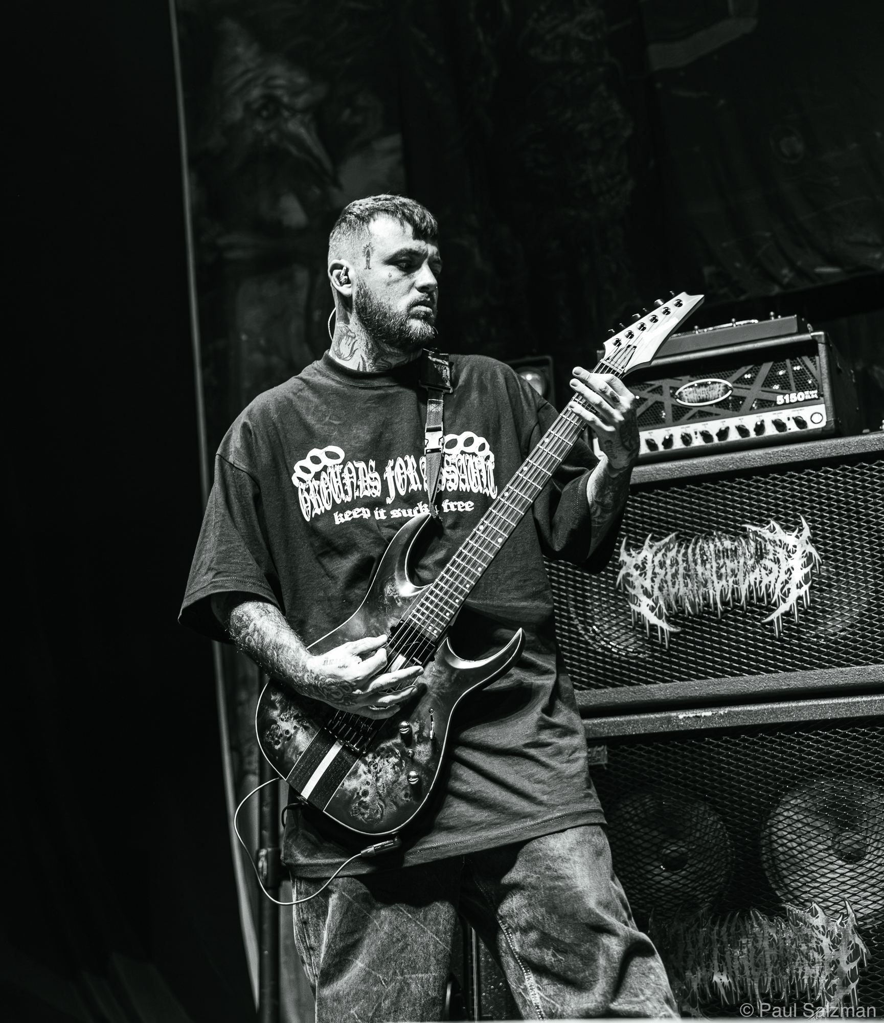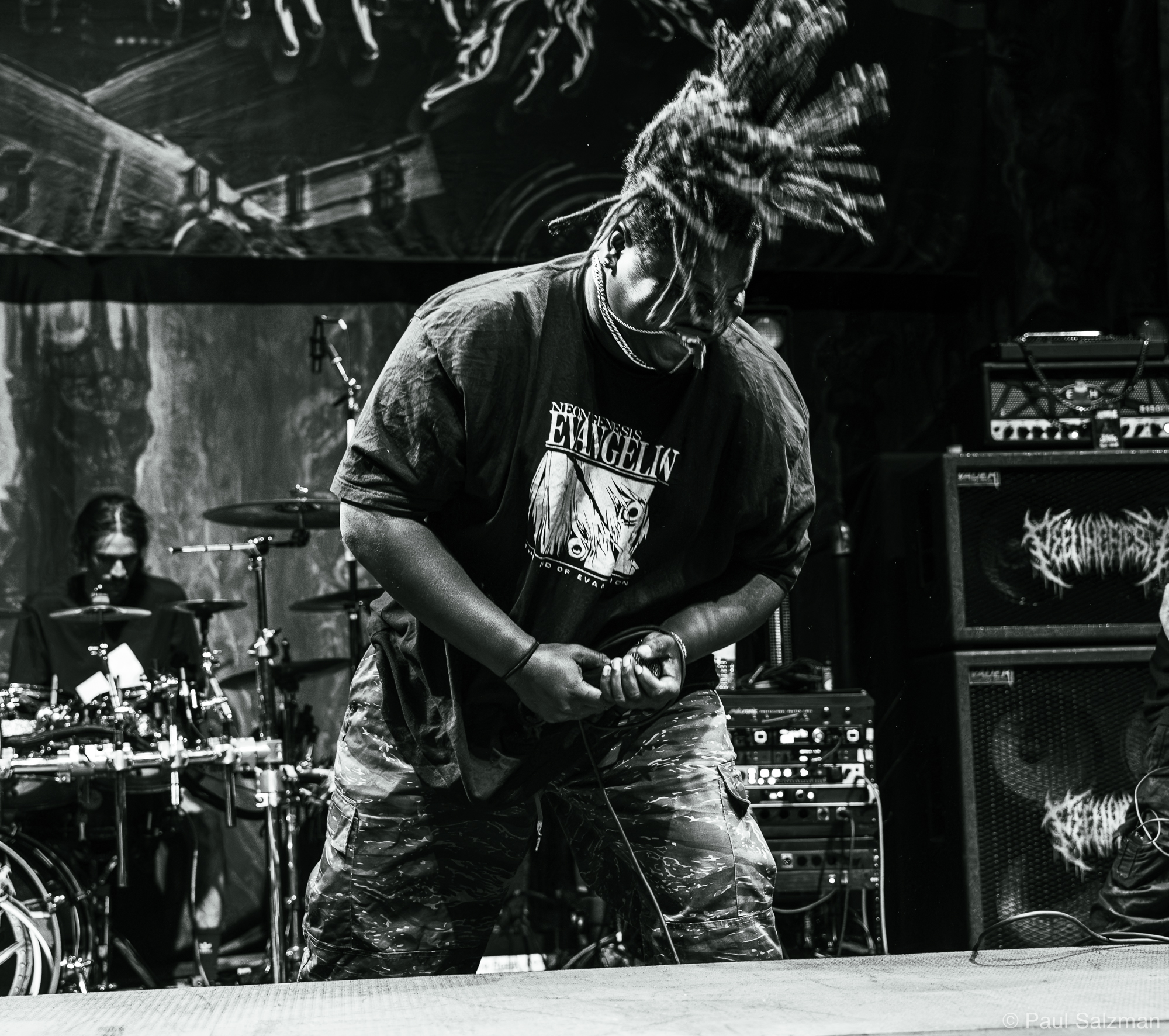 By 6:30 p.m., PeelingFlesh kicked things off. Hailing from Oklahoma City, this relatively new band has exploded in popularity thanks to their viral mix of deathcore, death metal, and sample-heavy humor—borrowing from memes, movies, and rap tracks. They’ve been hard at work on a new album and have toured relentlessly across both hardcore and death metal bills. Their unique sound had the crowd hyped from the jump.