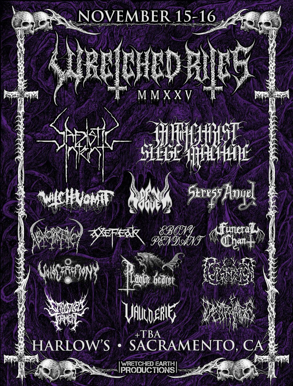 Sacramento just received its first dose of what is billed as “the West Coast’s most depraved celebration of blasphemy and barbarism” in the form of Wretched Rites MMXXV—a two-day music event held in downtown Sacramento at the always-accommodating Harlow’s on November 15–16, 2025. The festivities also included a pre-fest show on Thursday night at Café Colonial, another mainstay of the local metal scene. A scene remains alive and kicking thanks to promoters like Wretched Earth Productions.