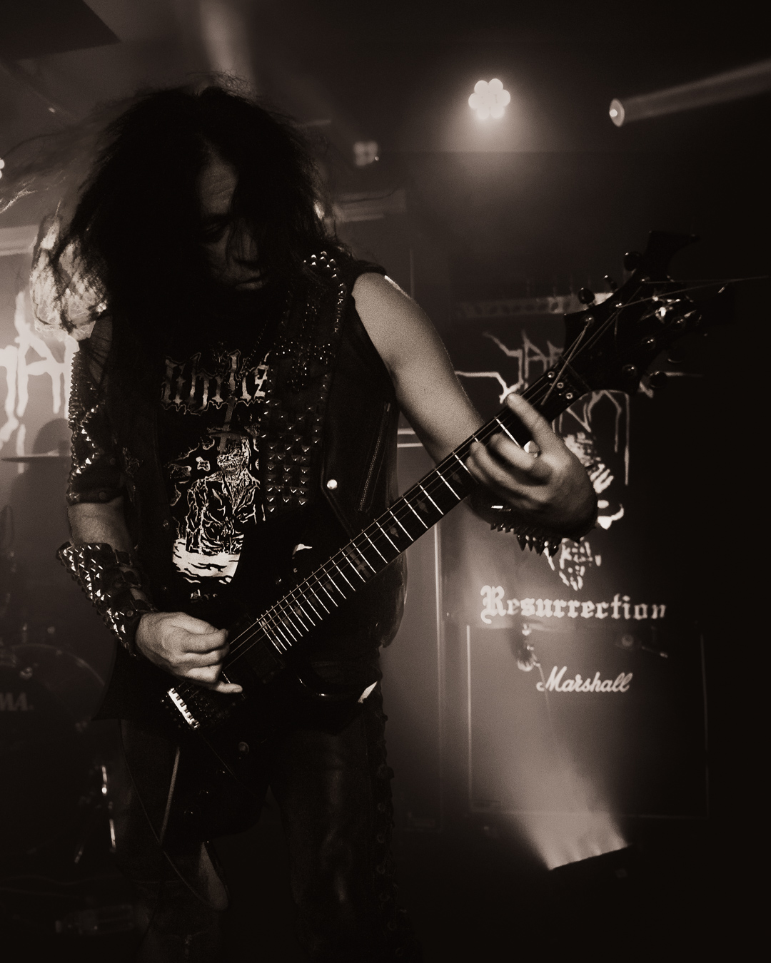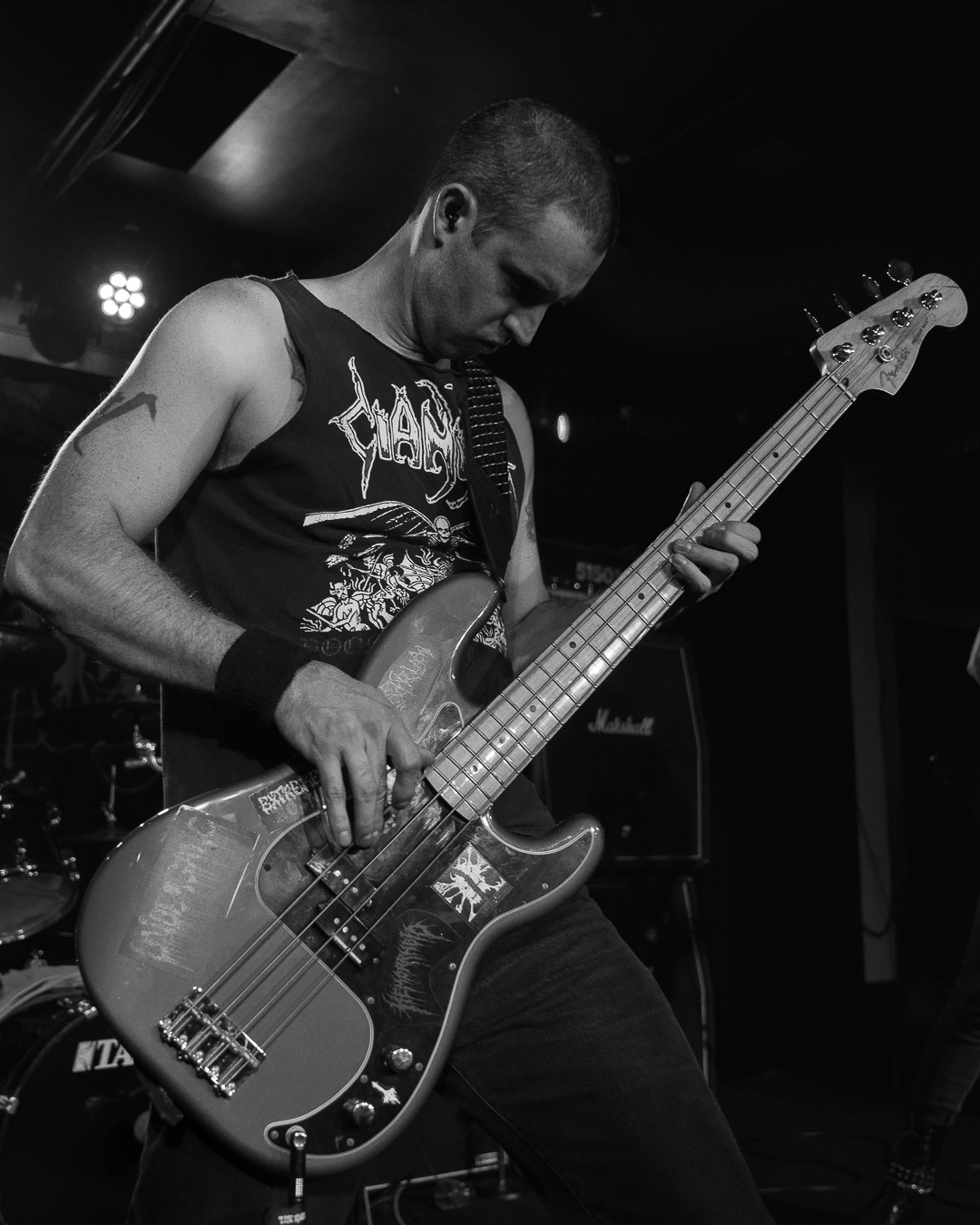 For many of these bands, it was their first time not only in Sacramento but on the West Coast. Day 1 brought local band Abhorrency to the stage to officially kick the fest off with their brand of blackened death. Vauldarie, Pig’s Blood, and Primitive Warfare filled out the early afternoon of Saturday’s lineup. By the evening, the heavy hitters were taking the stage one after another. Horns & Hooves, from Brooklyn, NY, making their West Coast debut, were a particular highlight for me—the unique vocal style of Angelo Oliveri rang through the venue like a banshee wail that sent shivers down my spine. Also among my favorite performers of Day 1 was Witch Vomit, visiting from Portland, OR for their Sacramento debut. Last, but definitely not least, were death metal legends Sadistic Intent. This Los Angeles–based Latino death metal band, active since 1987, closed out night one of Wretched Rites.
